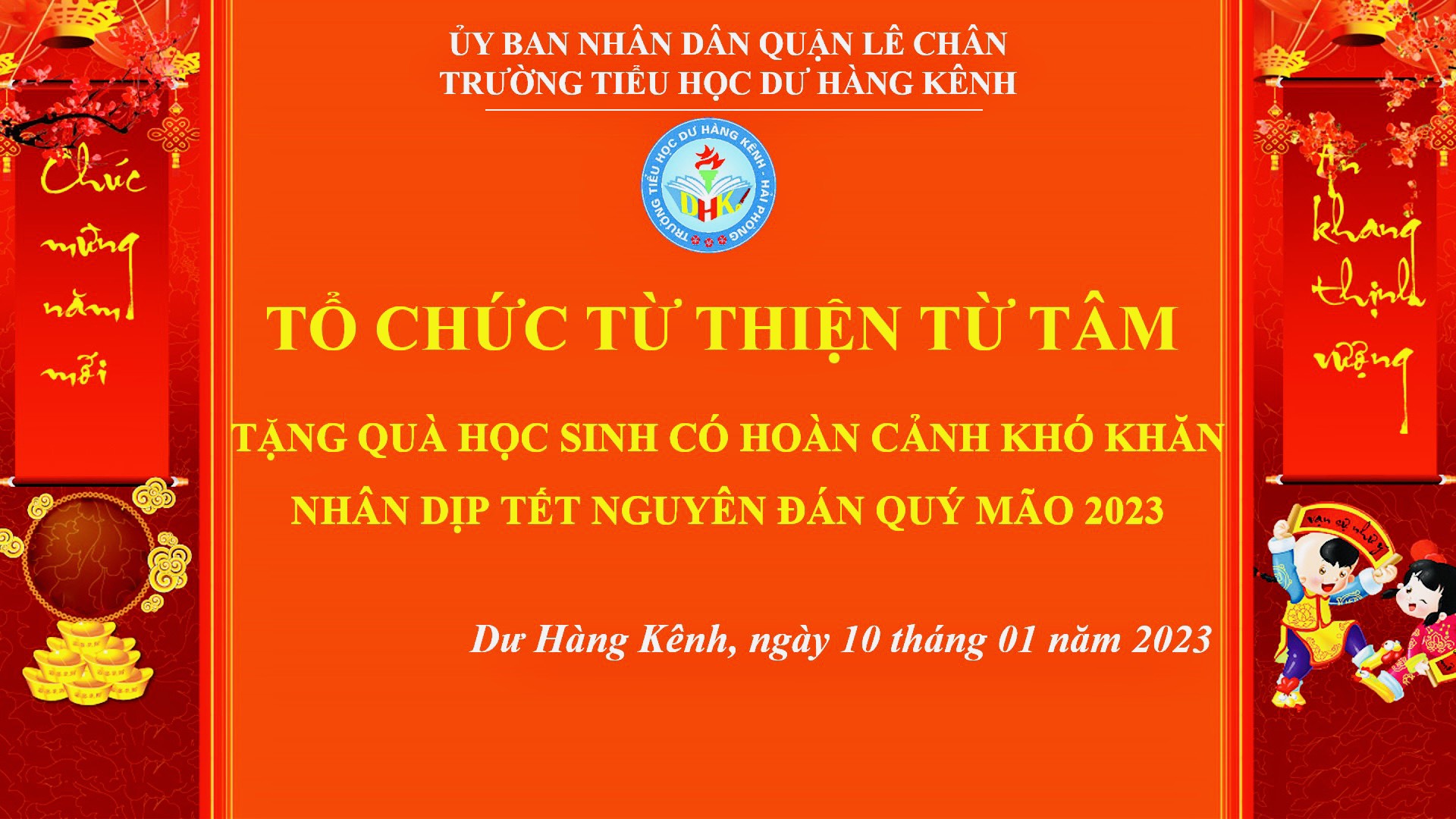 Với tinh thần tương thân tương ái, tình nguyện hướng về cộng đồng, giúp đỡ học sinh có hoàn cảnh khó khăn trong dịp Tết Quý Mão, ngày 10/01/2023, trường Tiểu học Dư Hàng Kênh kết hợp với tổ chức “Từ thiện Từ Tâm” đã tổ chức chương trình tặng quà cho các em học sinh có hoàn cảnh khó khăn.